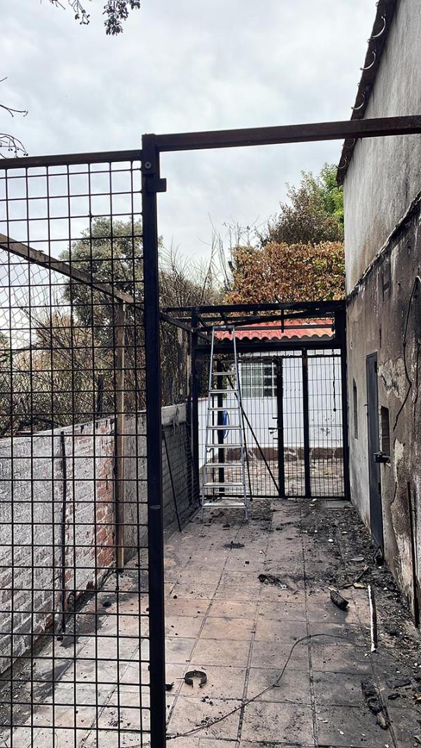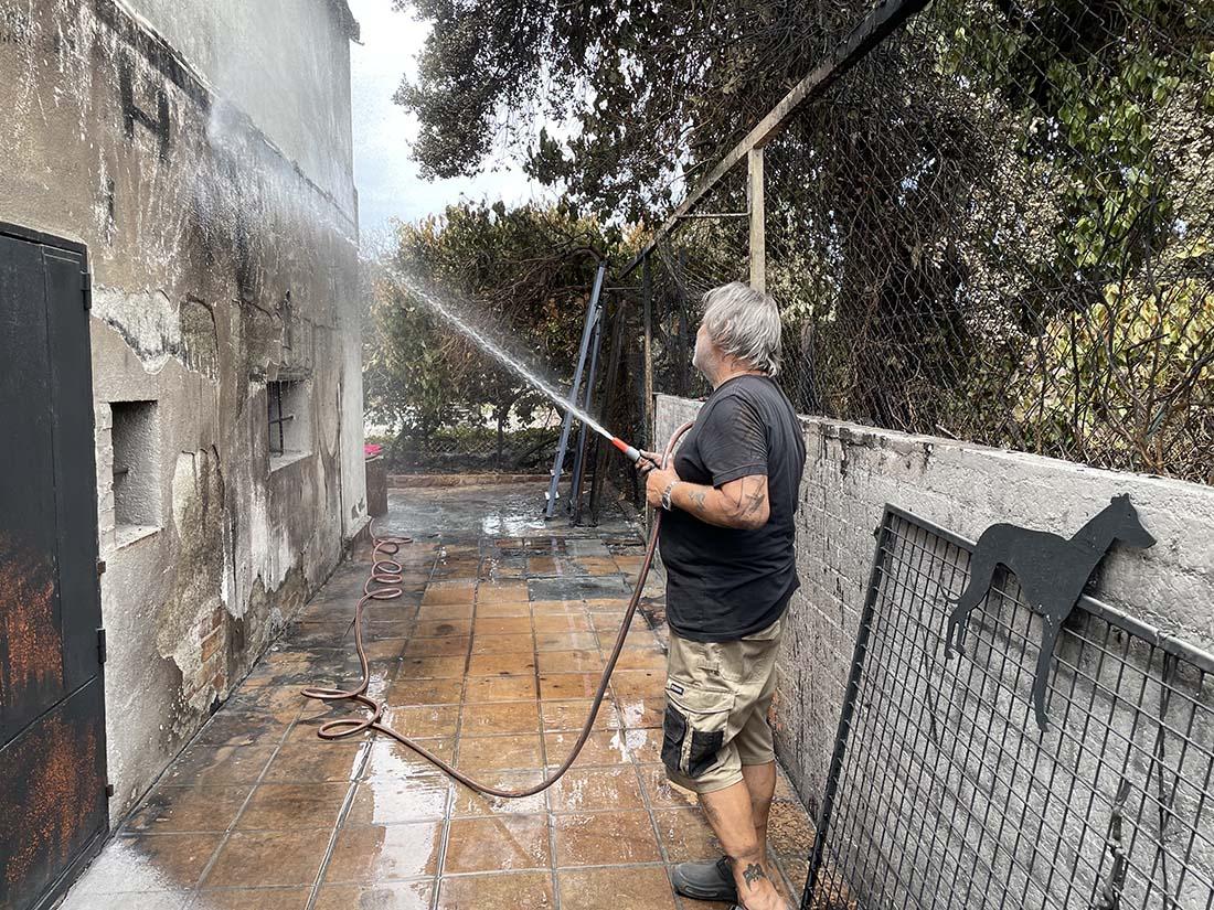 Sinds heeft Dirk niet stilgezeten. Hij heeft in vier dagen alleen de veranda afgebroken, daarna alle afbraak naar een container, die de gemeente ter beschikking gesteld had van de getroffen inwoners, gesleept die spijtig genoeg aan het einde van de straat stond. Daarna de takken van verbrande bomen en struiken en hagen langs beide kanten verwijderd met als gevolg dat we nu vrije inkijk hebben bij de buren en vice-versa. De realiteit daarvan is dat de respectievelijke honden zich vergapen aan mekaar en niet alleen dat, er wordt ook over en weer “gecommuniceerd”. Tot nu geen probleem maar uiteraard kan het uit respect naar de buren zo niet blijven want op die manier kunnen er ook geen honden meer gesteriliseerd worden in de kliniek wetende dat hun aantal soms oploopt tot 30 per dag en een meervoud daarvan. Dus is er maar één oplossing en die oplossing is een muur zetten want een haag vraagt jaren om zo groot te worden als die van ons was. Hoe dan ook de kliniek is gespaard gebleven maar zwart gerookt, vol roet, de raampjes naar de veranda zijn gesprongen van de hitte en de binnenkant van de deur hangt vol brandblaren en gesmolten verf. Nu pas kan je zien hoe hoog de hitte opgelopen is en hoe erg de arme hond die niet weg kon moet afgezien hebben. Verschrikkelijk allemaal maar het kon nog erger, de kliniek kon afgebrand zijn met de hond erin, het heeft niet veel gescheeld zien we nu.