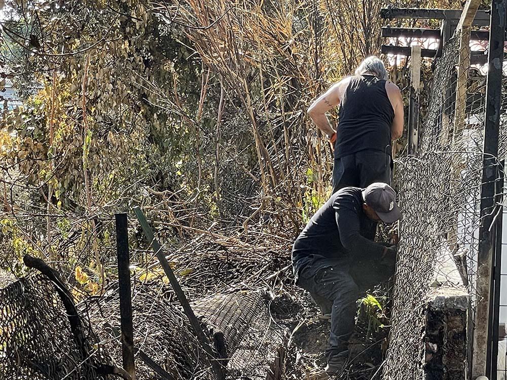 Rafa is er zoals afgesproken om 10 uur en nadat ze poolshoogte genomen hebben gaan ze aan de slag. De afsluiting gaat eraf, daarna zijn de verbrande en verkoolde boomstronken aan de beurt en wat rest van de oude afsluiting wiens oude verweerde wortels net als eeuwenoude wijnranken zijn en vergroeid met deze van de buurman, wat het niet eenvoudiger maakt. Als dat voor een deel gedaan is en buren terug geholpen hebben met het wegbrengen duiken ze de diepte in en beginnen het struikgewas en de verbrande bomen en varens en bamboe en de rest van verwilderde brousse die welig tierde achter de kliniek en de grootste oorzaak was dat de veranda in de vlammen opging. Het wordt een lange uitputtingsslag die ik zo goed mogelijk in beeld breng. Niet evident als je weet dat ik niet goed mijn evenwicht kan houden en op de vloer vol gesmolten plastiek “van wat ooit de veranda was waar duizenden honden herstelden van hun sterilisatie “die bezaaid ligt met elektrische zagen, hamers, boomzagen, beitels, zwart verbrande en verkoolde boomstronken, flessen water en handdoeken voor de heren hun zweet enz.… kan ik al helemaal mijn evenwicht niet houden laat staan met één hand filmen zonder houvast.
